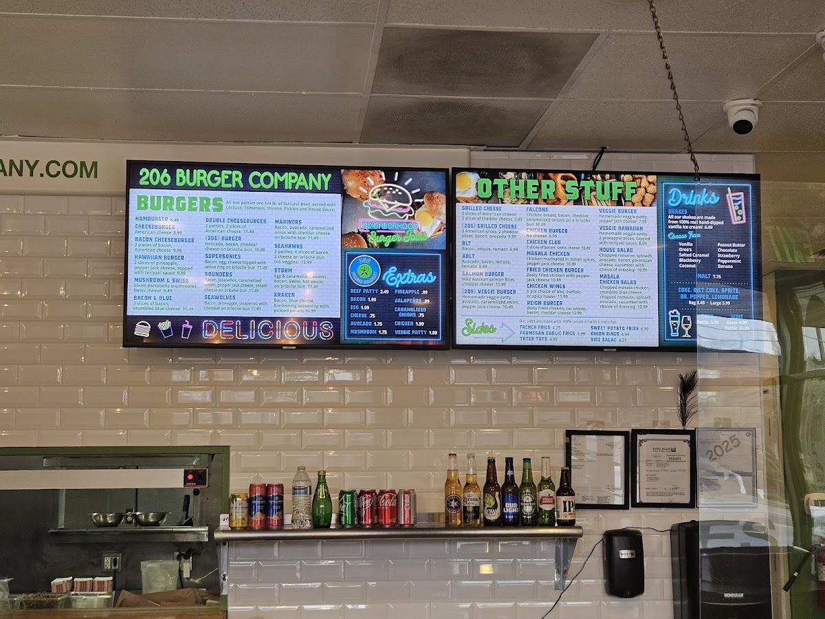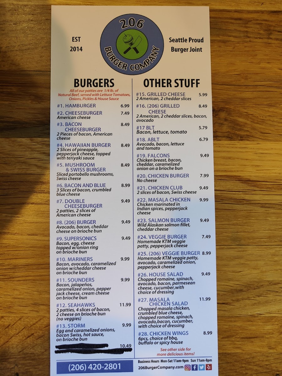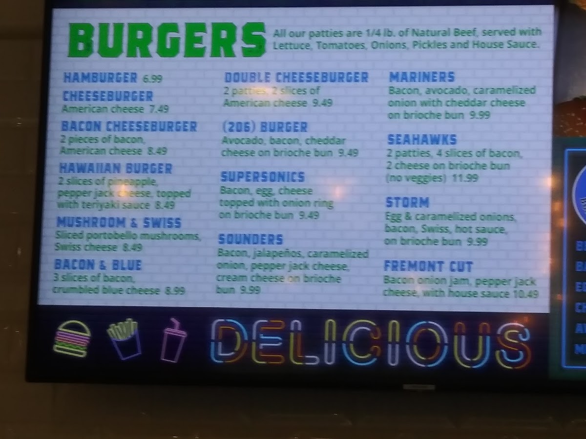 1/4 lb Natural Beef Patty, American cheese, 2 strips of bacon, Lettuce, Tomato, Onion, Pickle and house Sauce on a Sesame Bun.