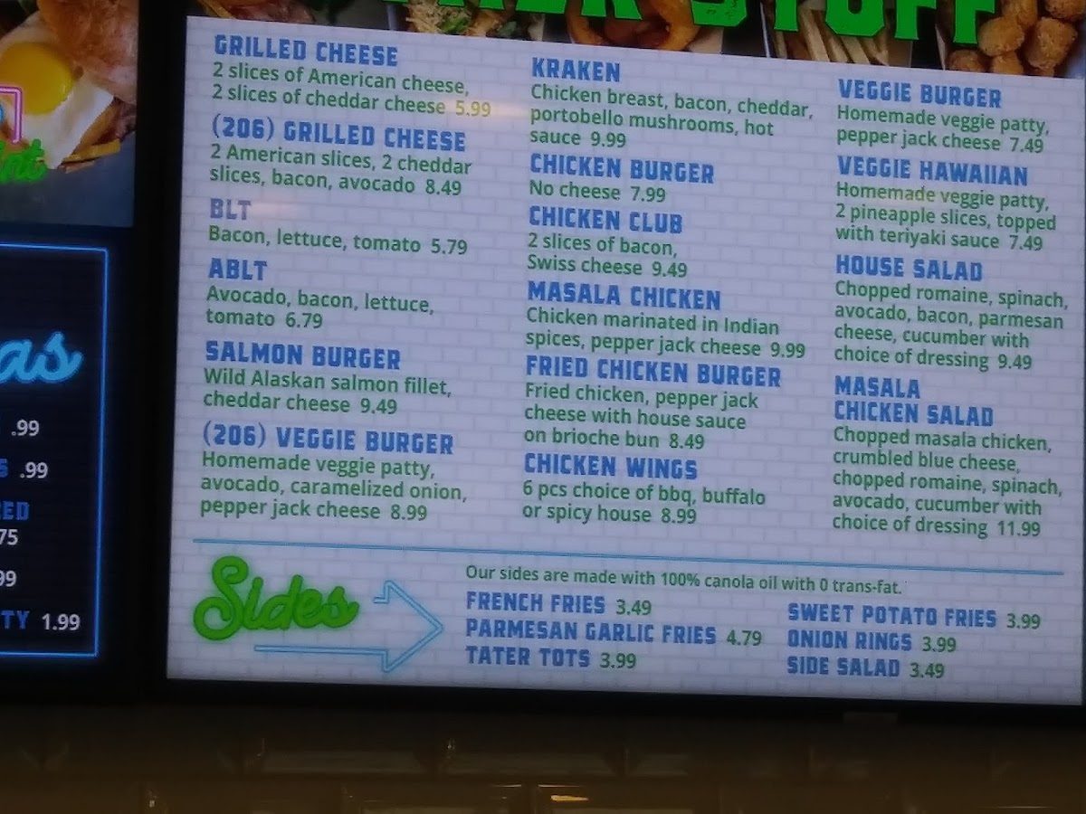 Wild alaskan salmon fillet, cheddar cheese, lettuce, tomatoes, onions, pickles and house sauce on brioche bun.